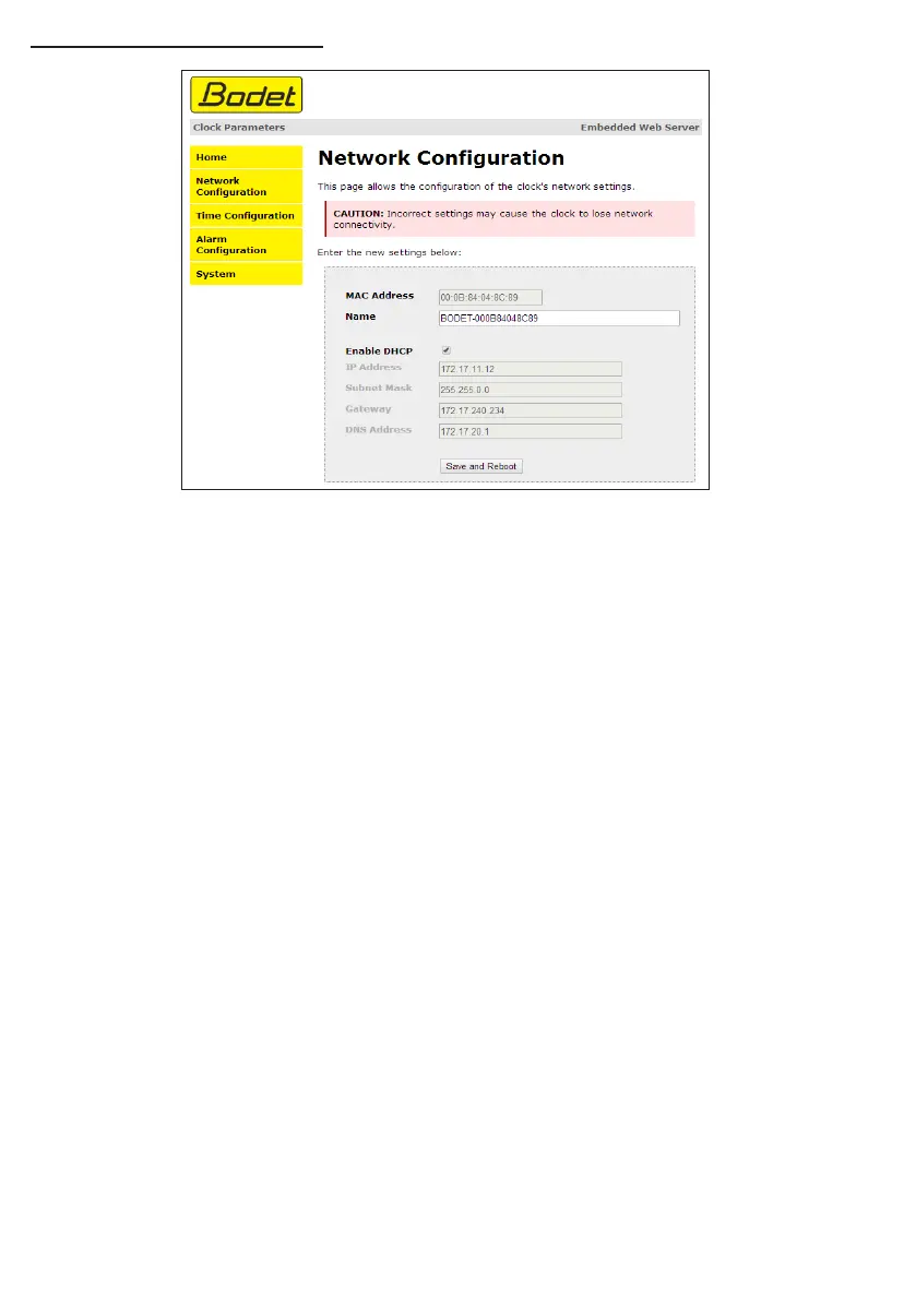 This page is for setting the clock’s network configuration. The warning reminds you that the clock