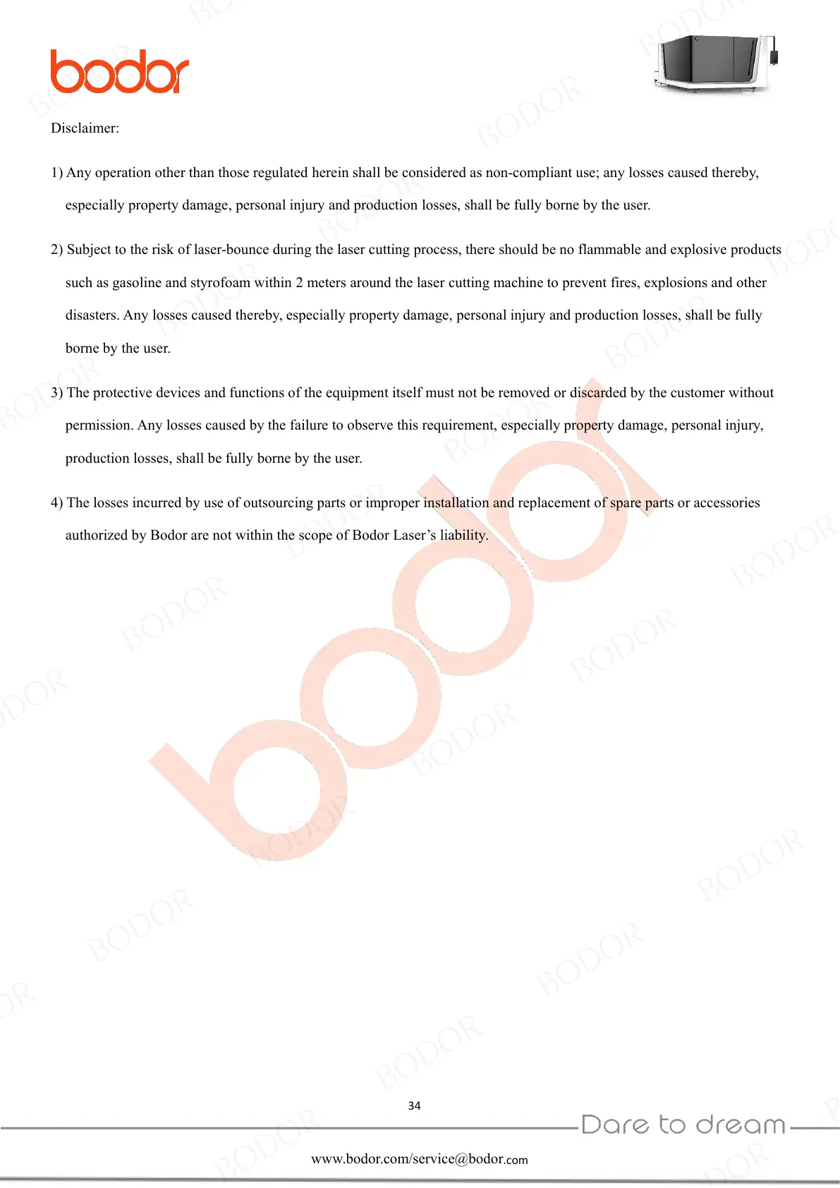 authorized by Bodor are not within the scope of Bodor Laser’s liability.