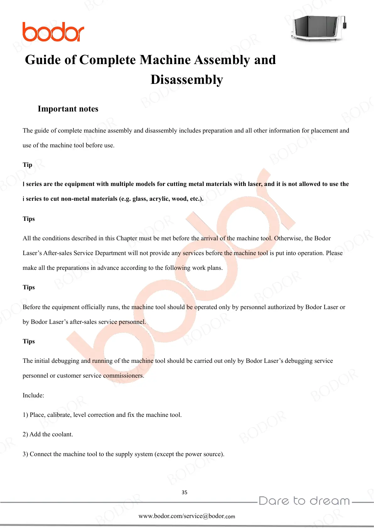 The initial debugging and running of the machine tool should be carried out only by Bodor Laser’s debugging service