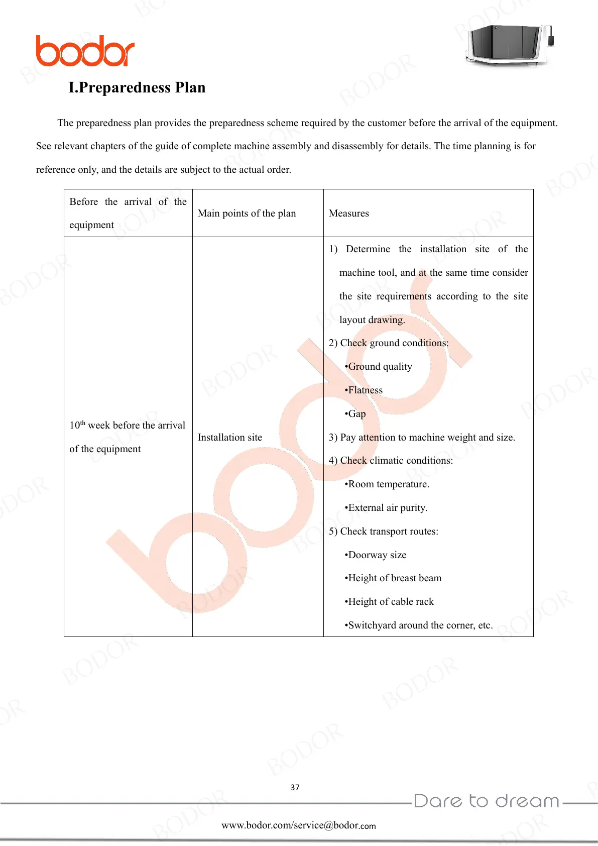 The preparedness plan provides the preparedness scheme required by the customer before the arrival of the equipment.