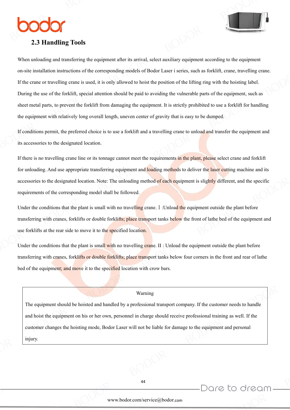 on-site installation instructions of the corresponding models of Bodor Laser i series, such as forklift, crane, travelling crane.