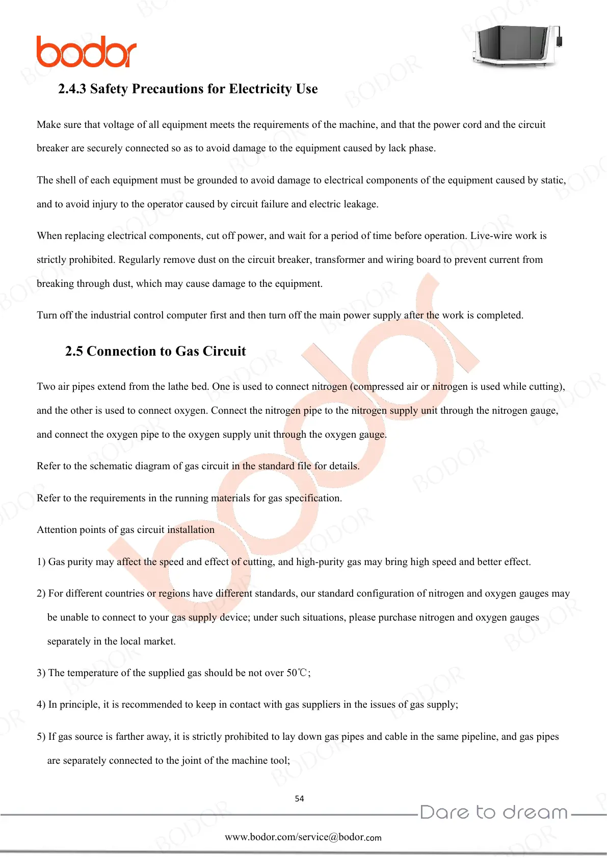 Make sure that voltage of all equipment meets the requirements of the machine, and that the power cord and the circuit