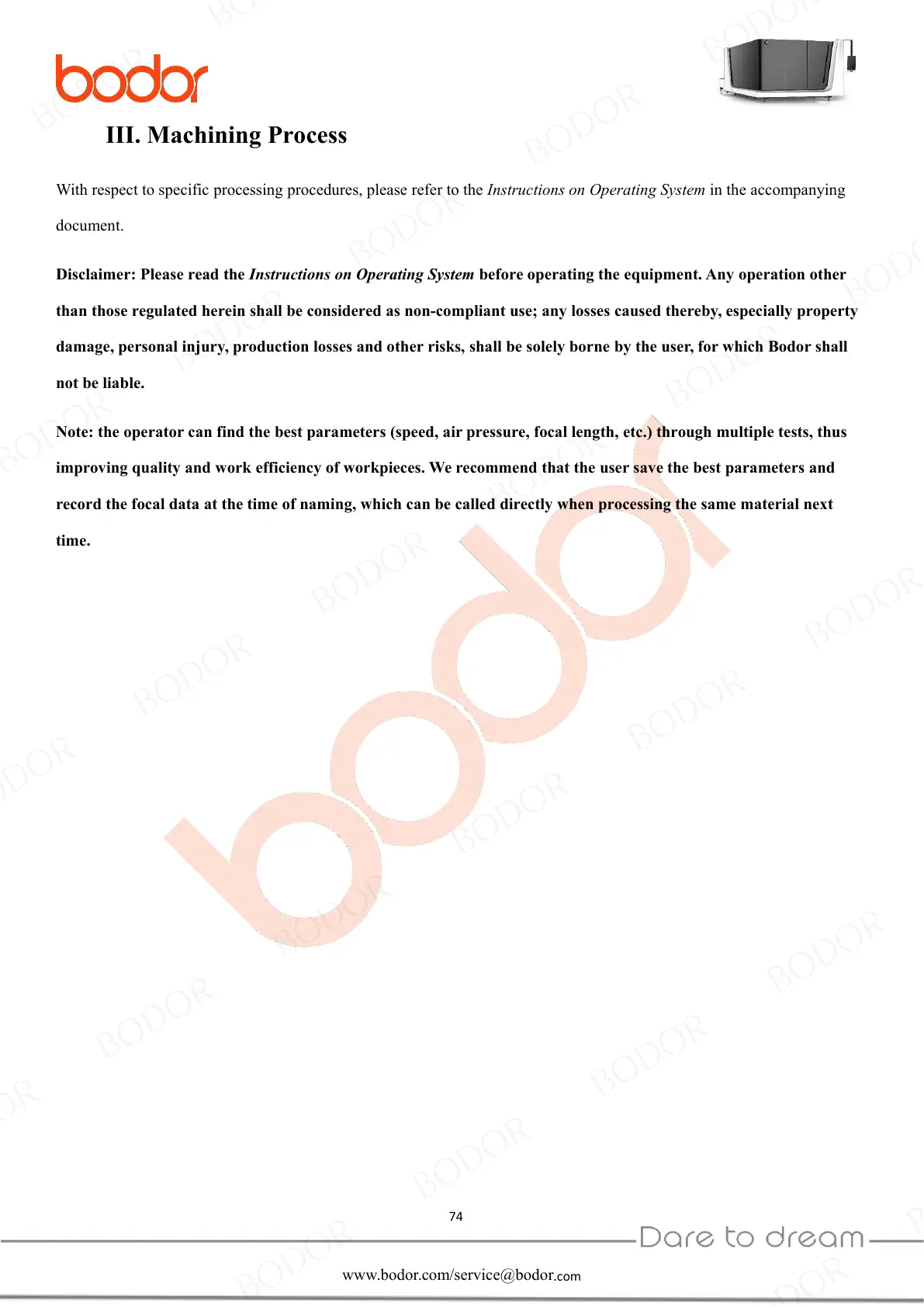 damage, personal injury, production losses and other risks, shall be solely borne by the user, for which Bodor shall