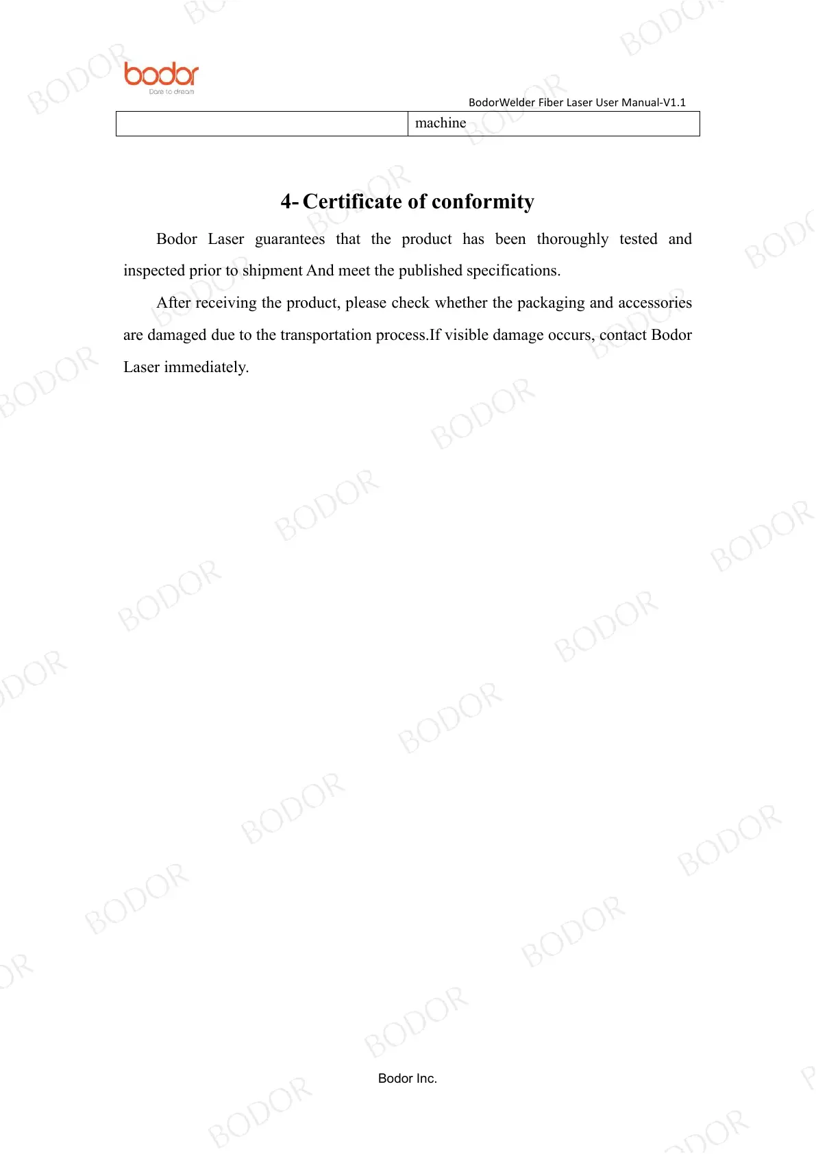 Bodor Laser guarantees that the product has been thoroughly tested and