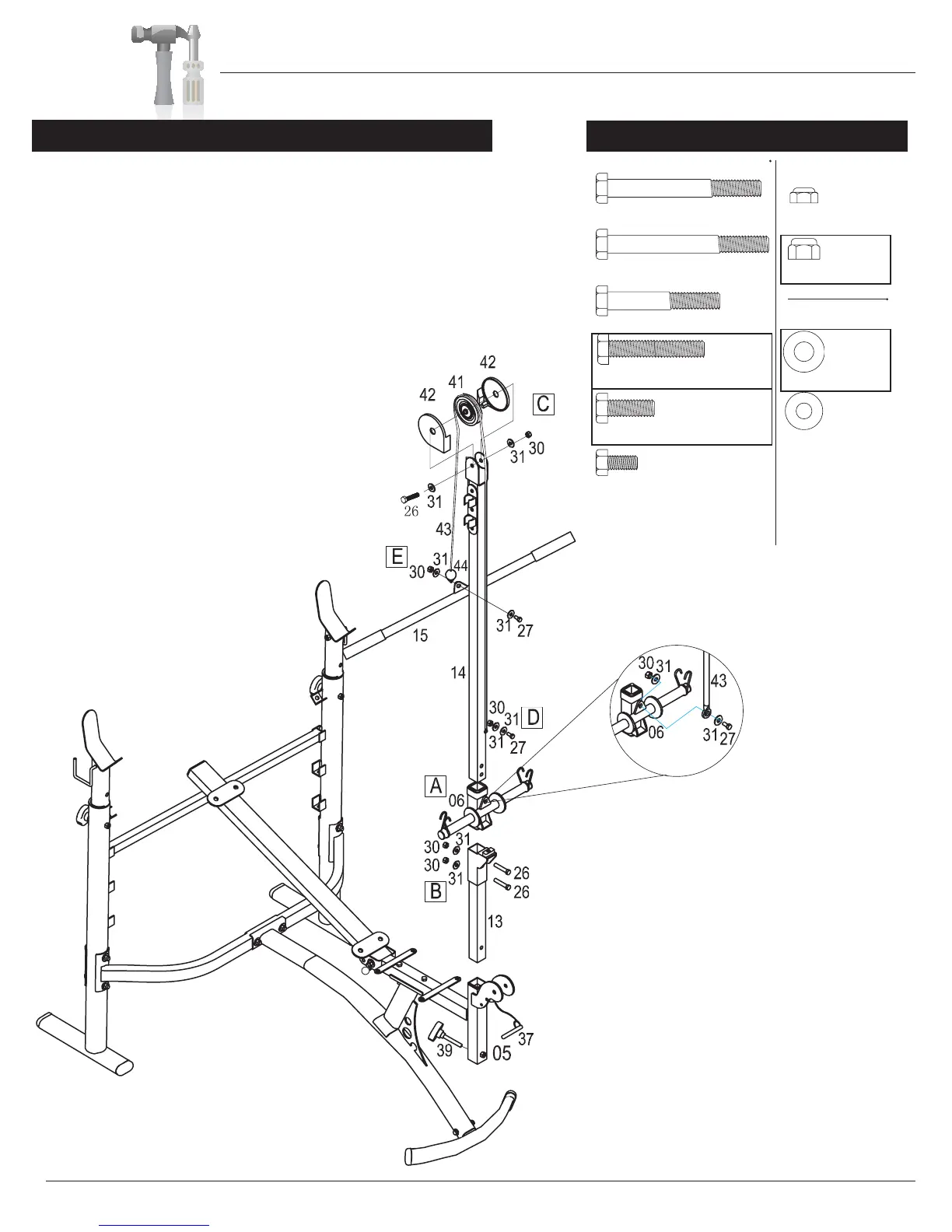 E. Secure the Lat Tower Bar (#15) to Lat Tower