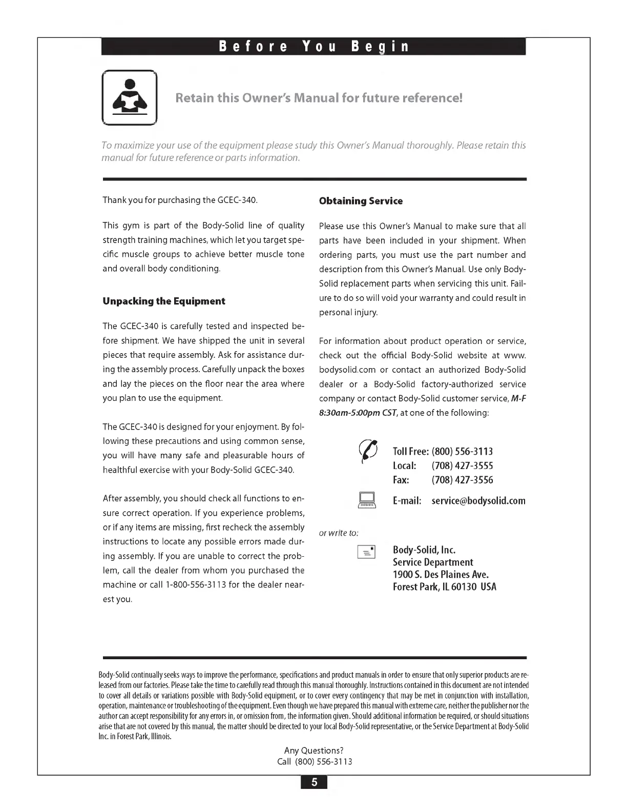 company or contact Body-Solid customer service, M-F