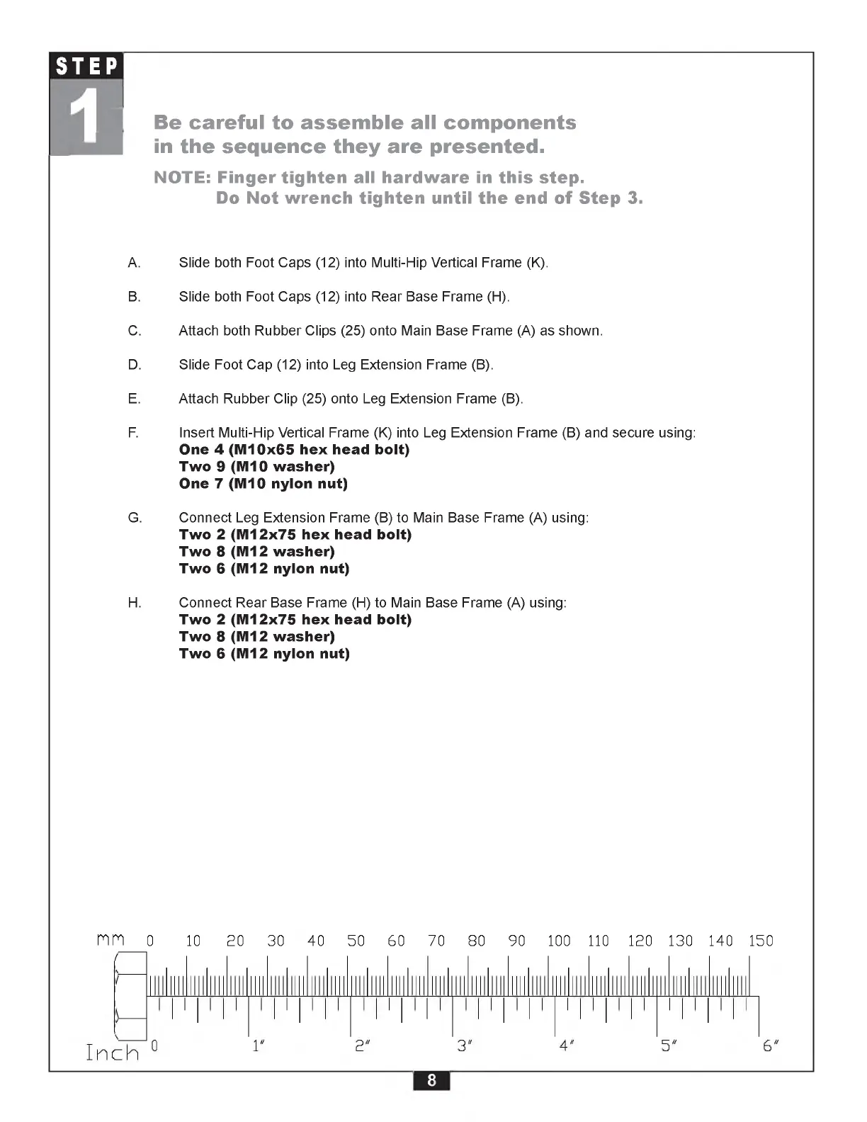 G. Connect Leg Extension Frame (B) to Main Base Frame (A) using: