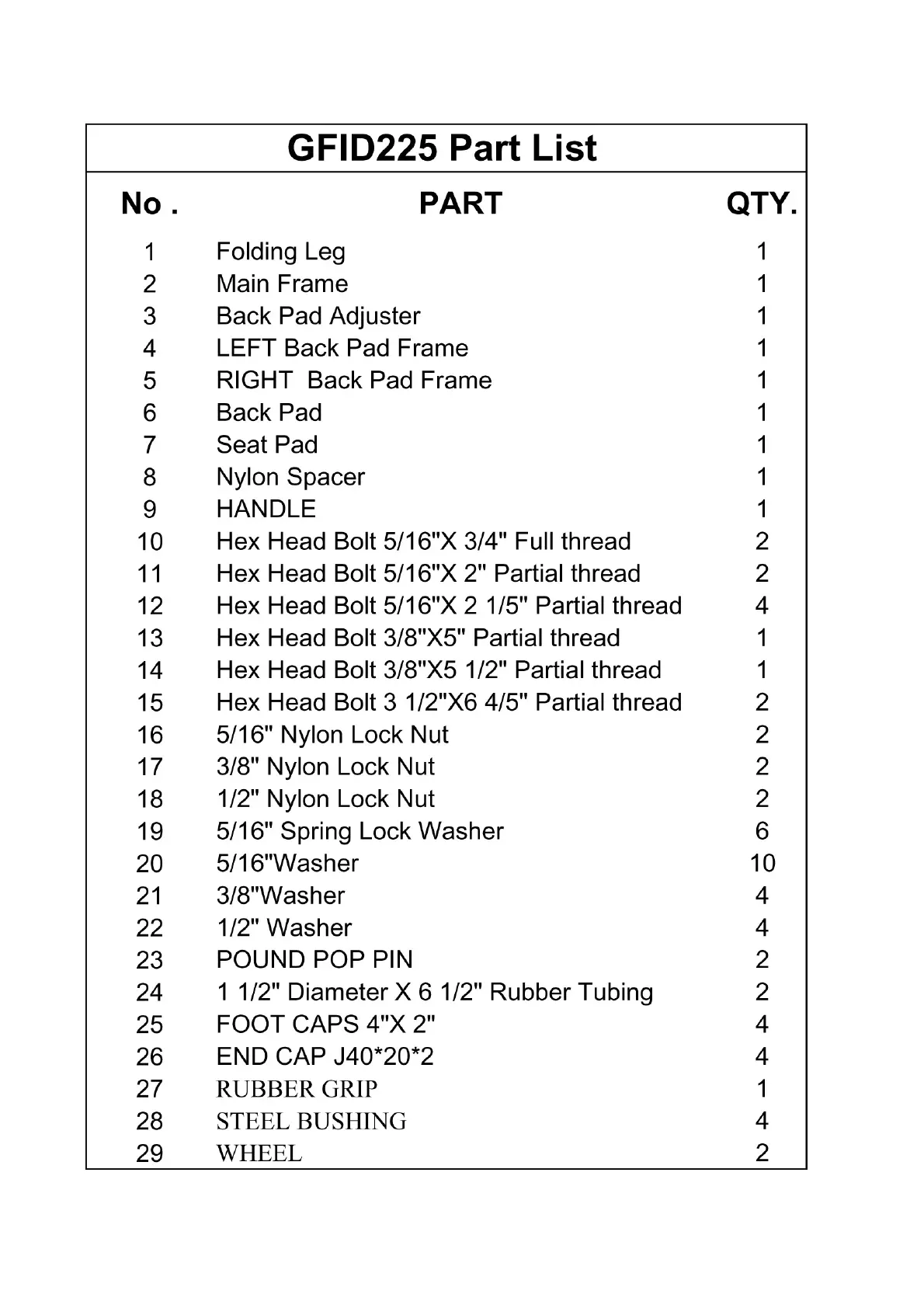 Body Solid GFID225 - GFID225 Part List