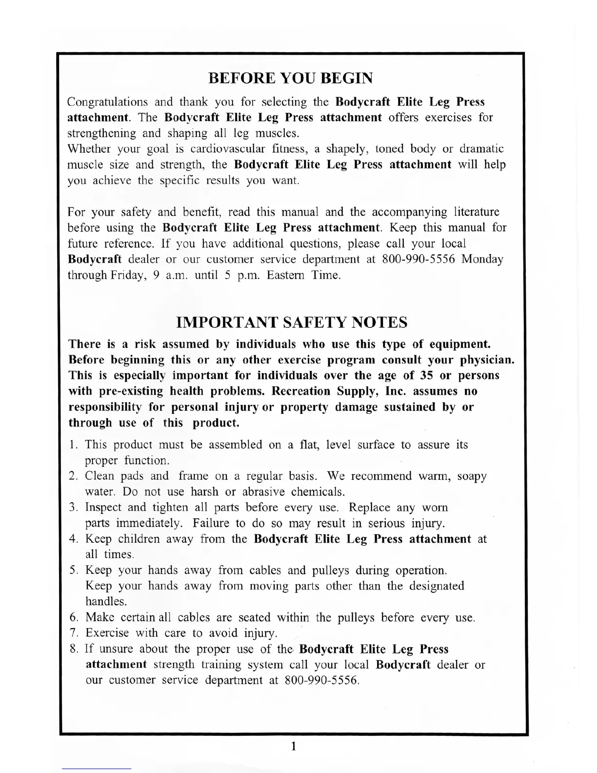 BodyCraft ELITE - Before You Begin; Important Safety Notes