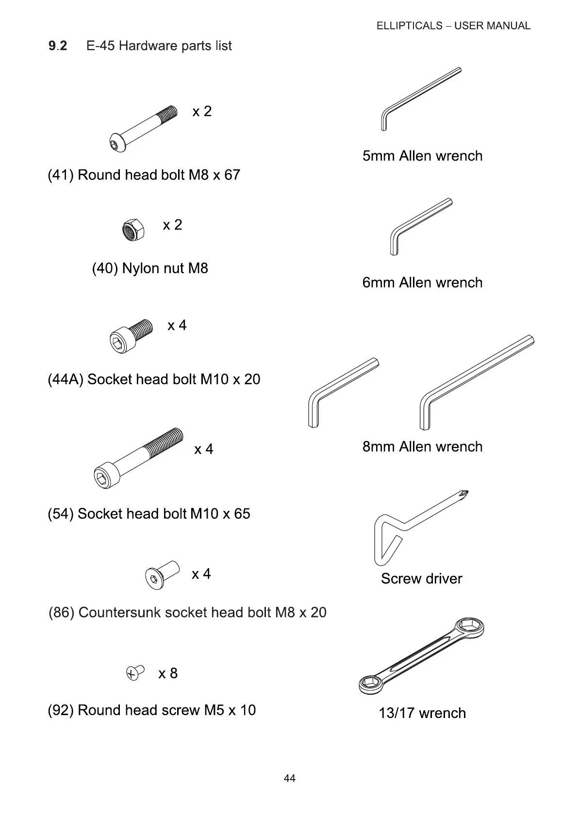 Bodyguard E-40 - E-45 Assembly Guide; E-45 Hardware Parts List