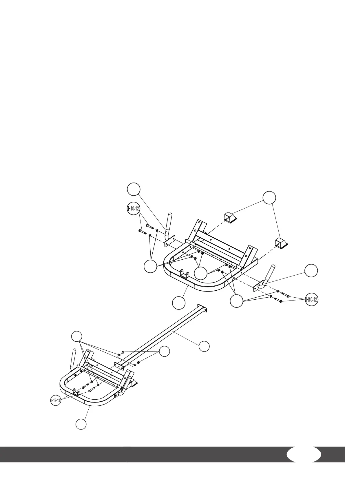 2. Attach the right handle (18) to the base front (1) with two bolts (H10-12), four washers (W10)