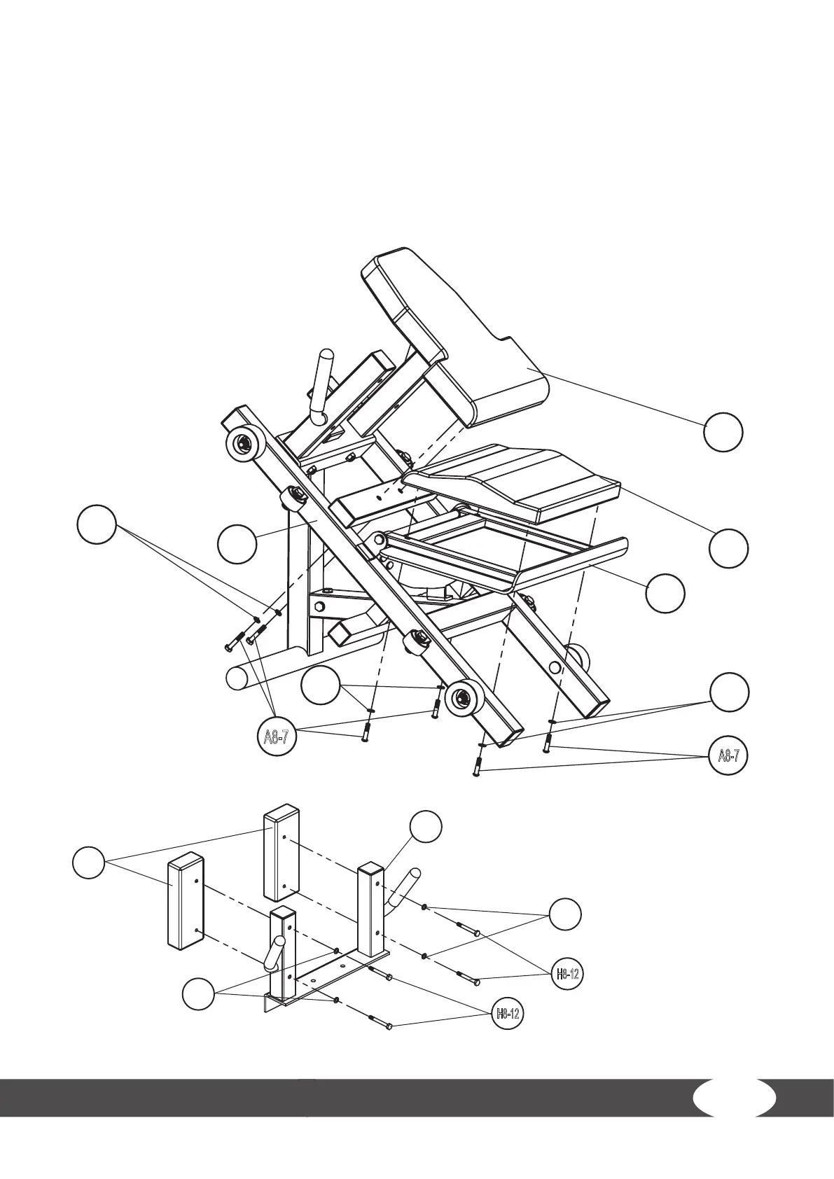1. Attach the upper back pad (14) to the leg press footrest (7) with four bolts (A8-7) and four