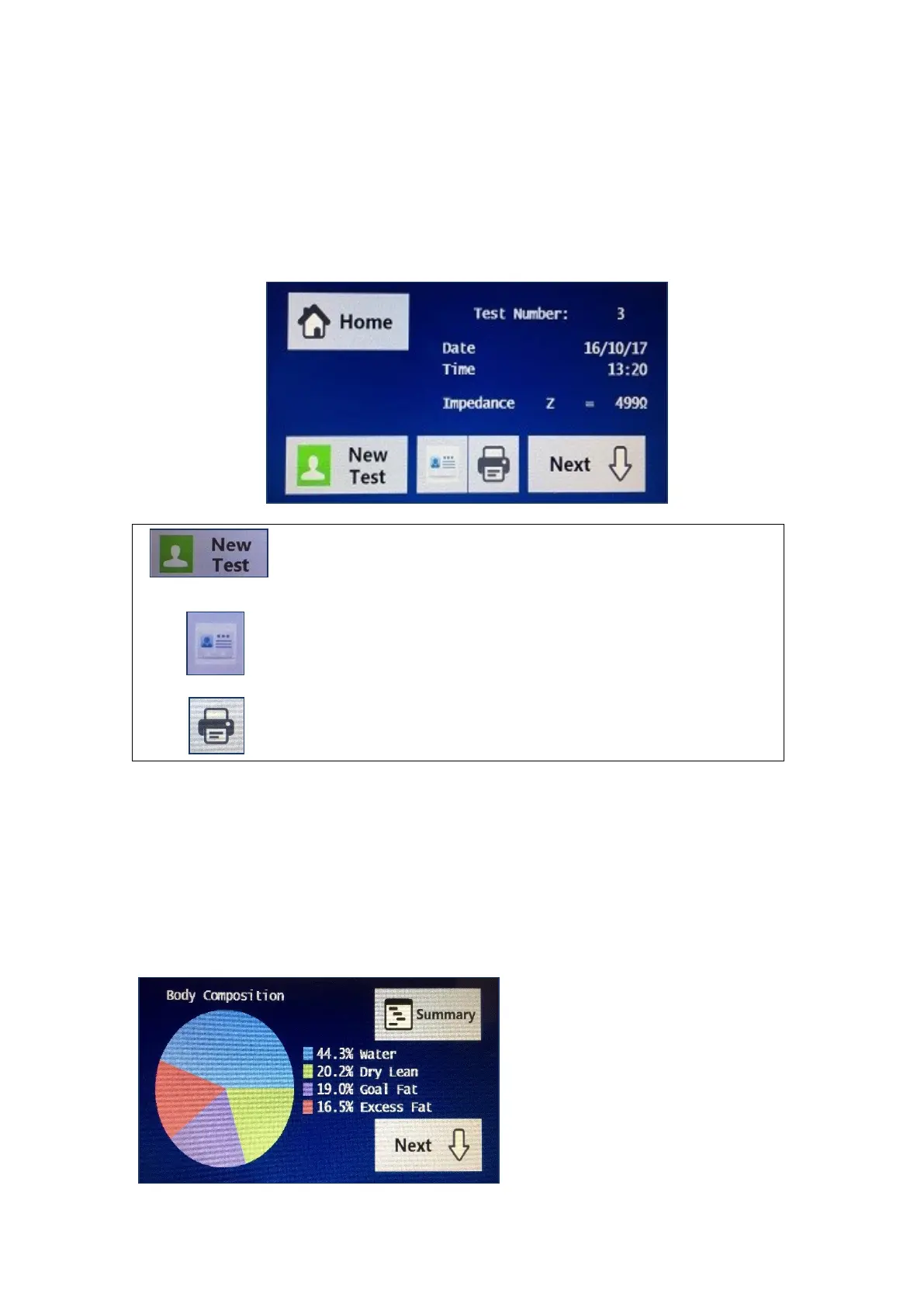 The first screen displayed is the test summary screen which shows the