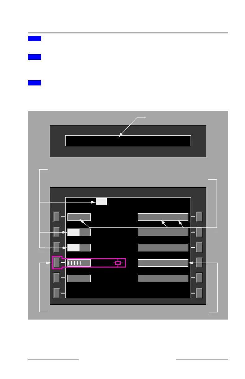 Display pages, select modes, and control displays. Caret “<” or “>” is before or