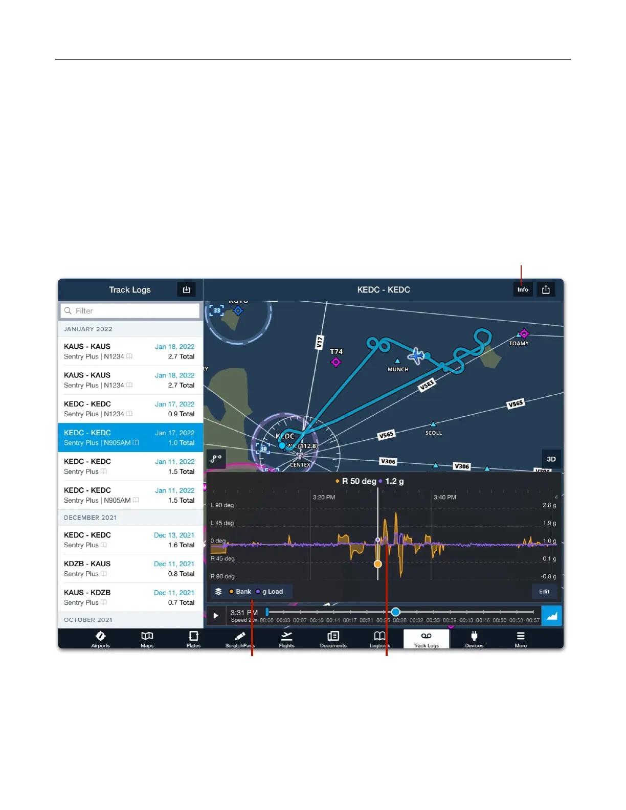 display the maximum g Load for a flight, select the Track Log Info button.