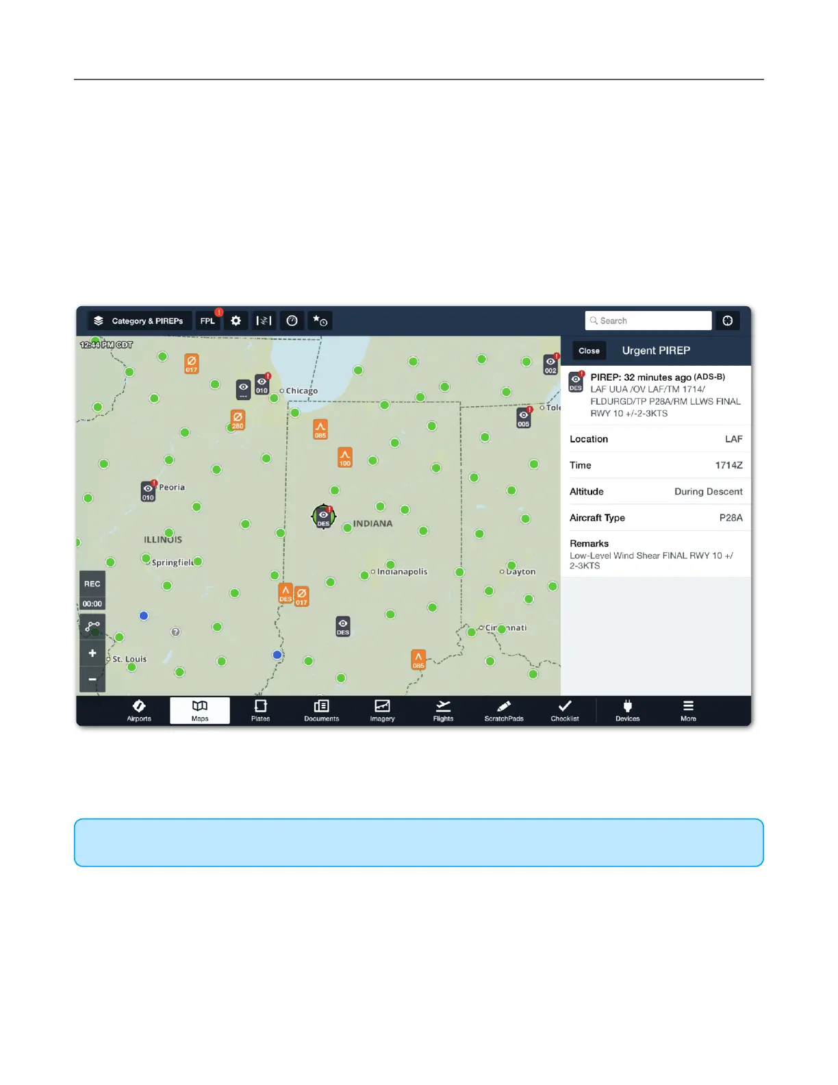 PIREPs are displayed graphically on the map when the PIREPs layer is active. Tap a PIREP to