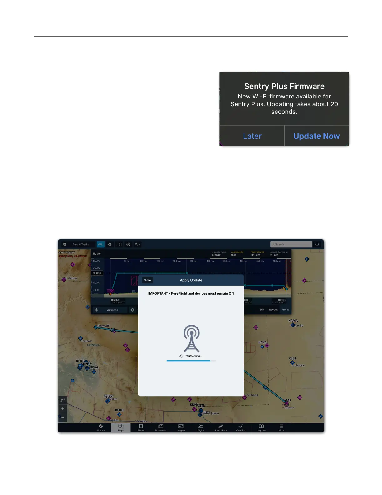 Sentry and ForeFlight must remain on while firmware is updated. As firmware is being