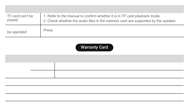 BOGASING S8 Pro - Troubleshooting Specific Problems; TF Card Playback and Speaker Operation; Warranty Information; Maintenance Records and Purchase Details