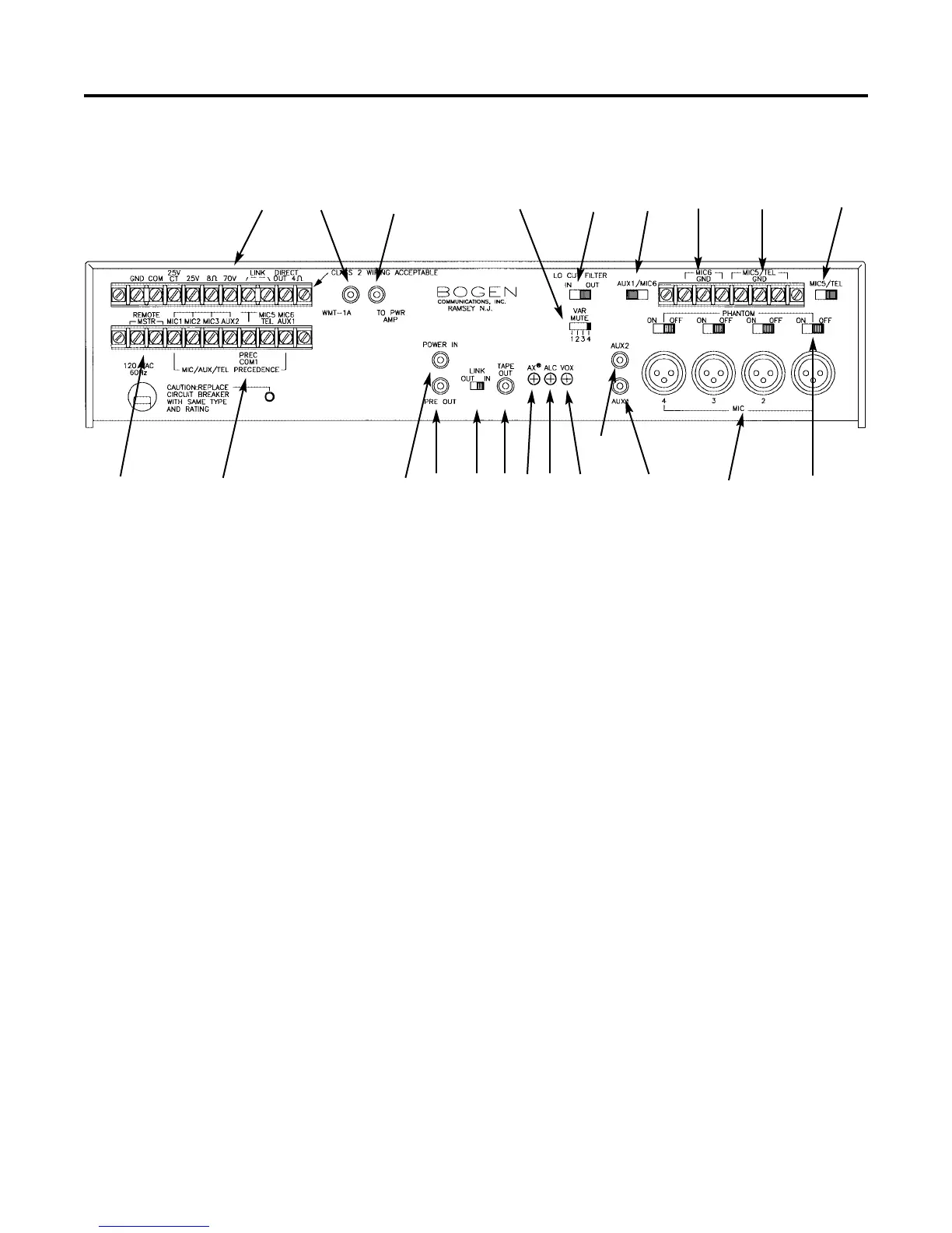 3. REMOTE MSTR - Screw terminal pair for connection of remote master volume control (Bogen model: