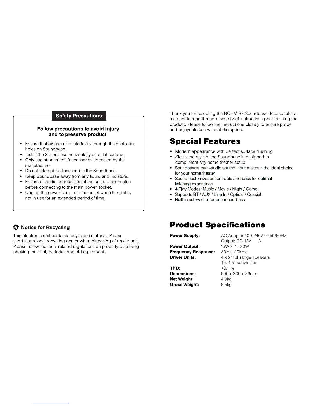 Thank you for selecting the BÖHM B3 Soundbase. Please take a