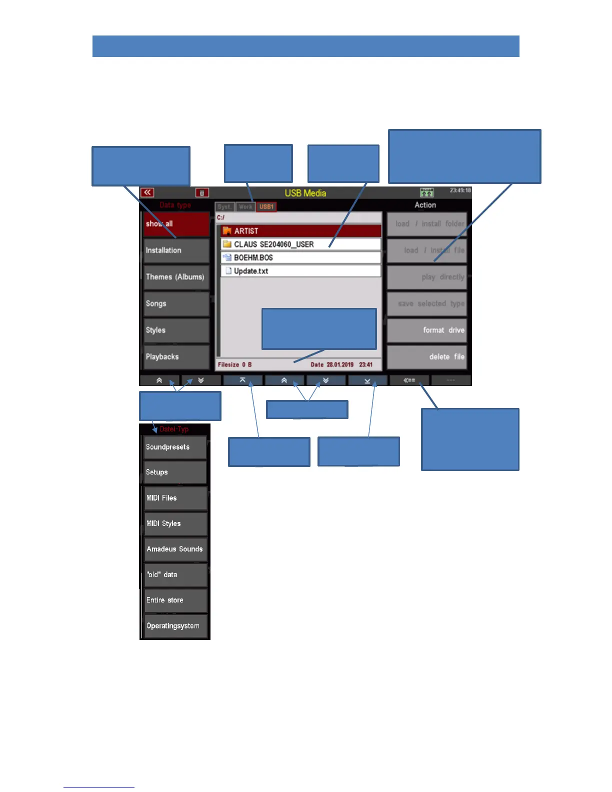 In this display menu you will find all the functions you need to save or load data to/from USB media:
