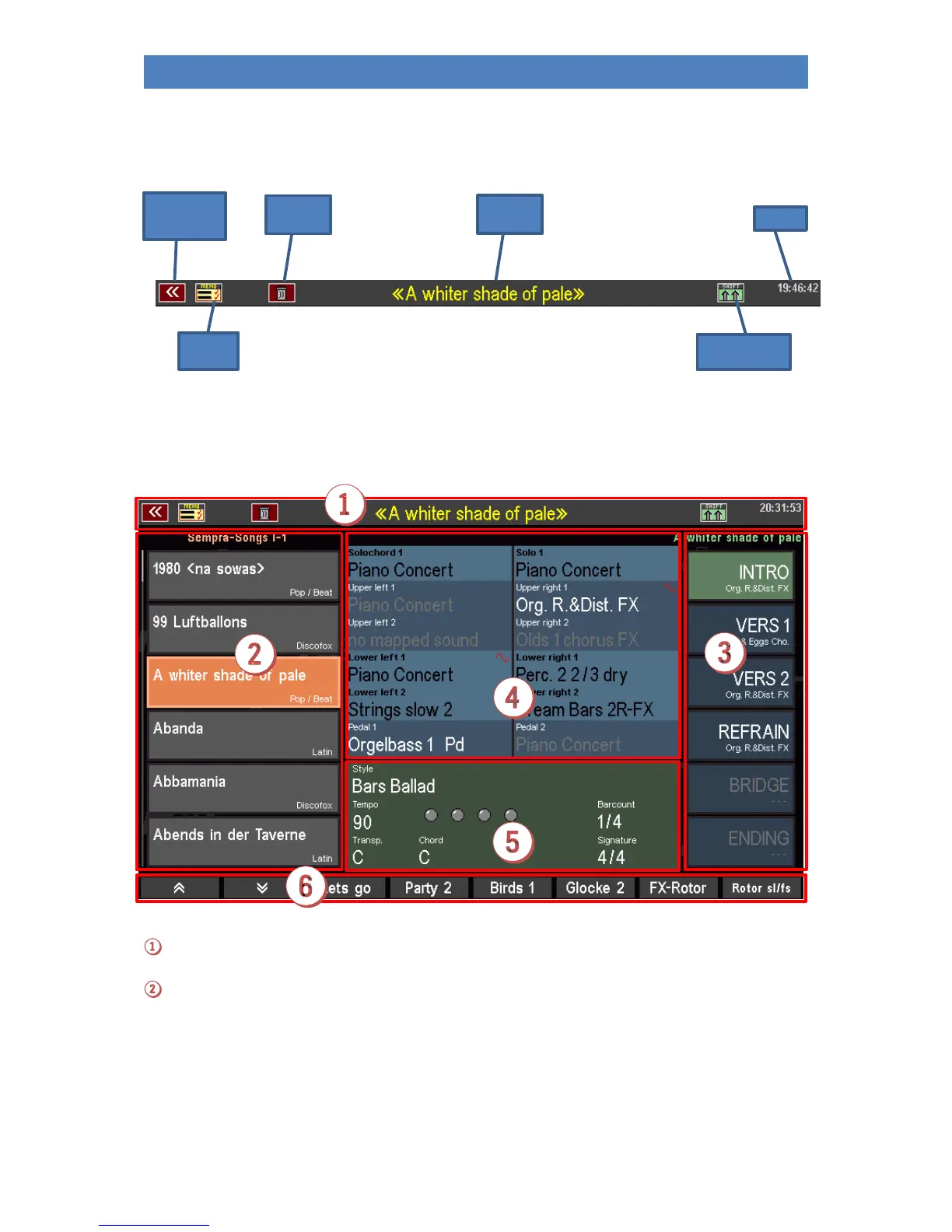 buttons [UP] / [DOWN] or with the data wheel. To call up a SONGS, tap directly on the list, press the