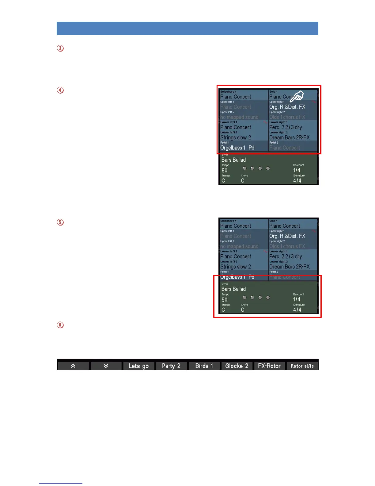 Here you can select the up to 6 individual SONG PRESETS (= Global Presets, i.e. complete settings of