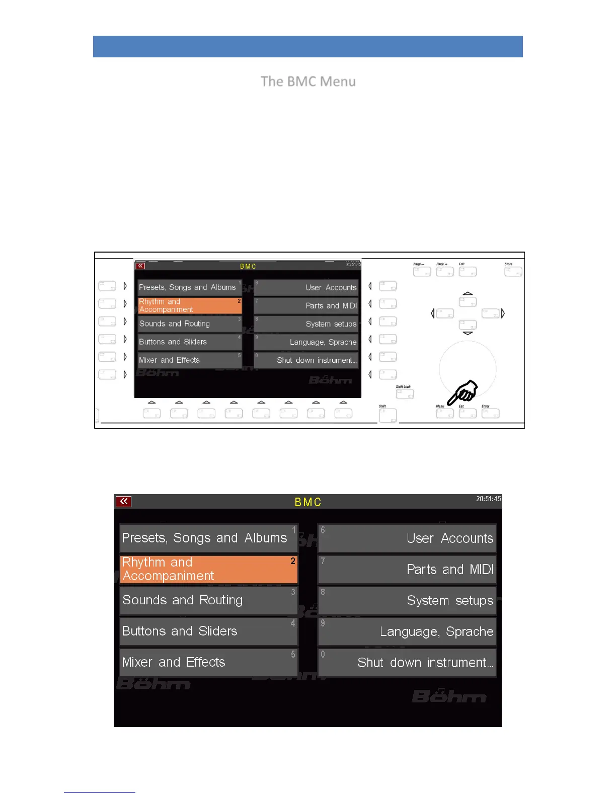 The BMC (Böhm Music Computer) menu is your gateway to numerous interesting functions and