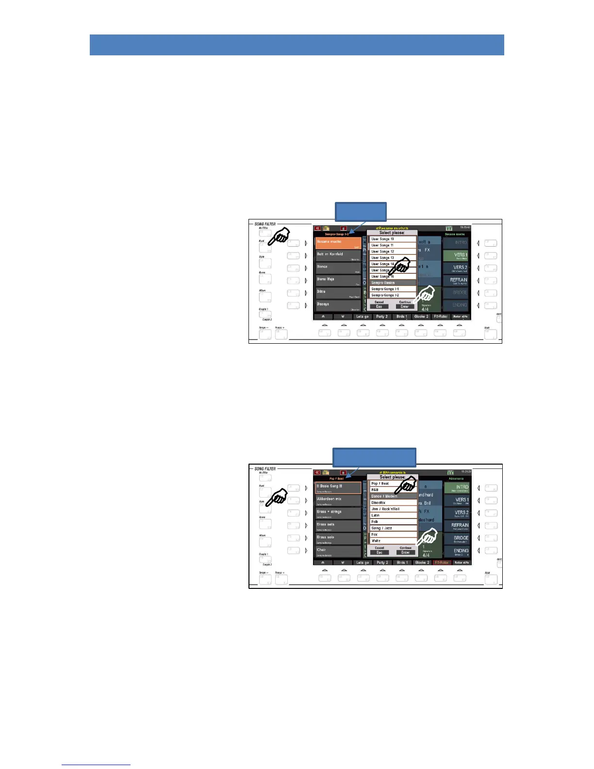 • To filter the SONG list, press one of the [Bank], [Style], [Genre] or [Album] buttons.