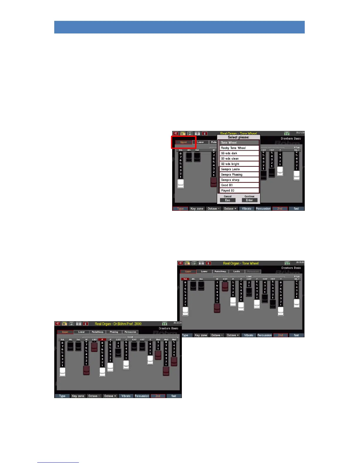 number of drawbars varies, functions in the areas of percussion or Leslie, resp. Phasing change