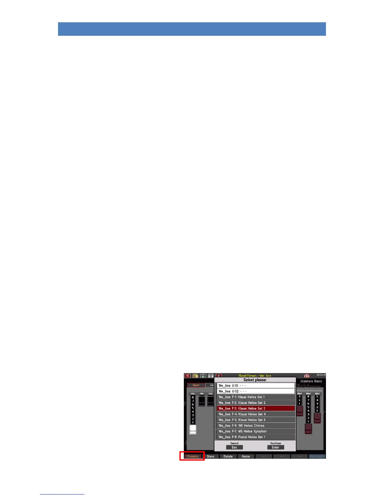 You can access the RealOrgan preset functions via the SHIFT level of the F buttons in the drawbar