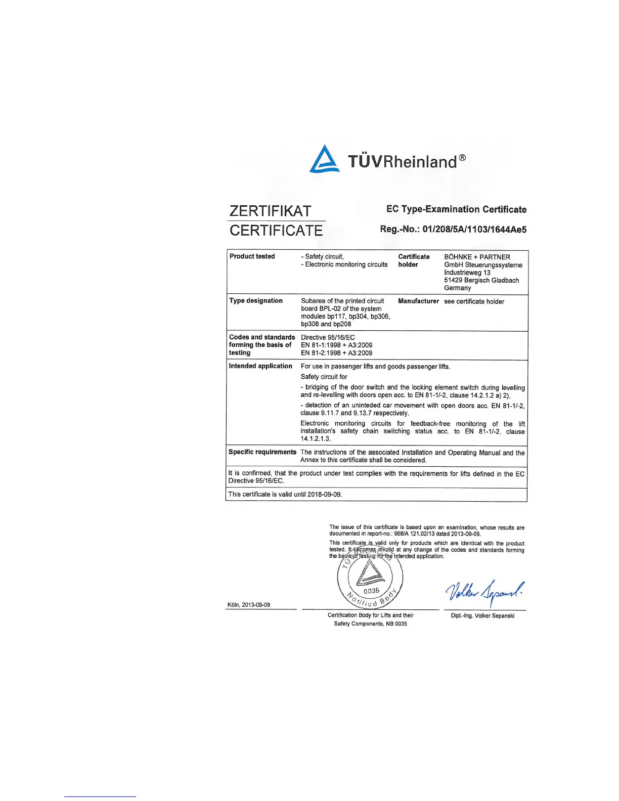 Böhnke + Partner bp308 - EC Type Test Certificate BPL 02 with SMZ