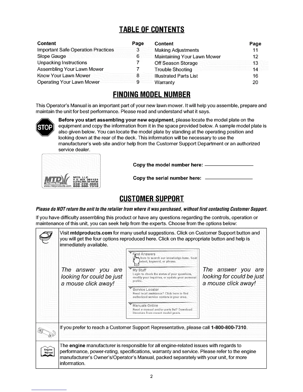 'Visit mtdproducts.com for many useful suggestions. Click on Customer Support button and