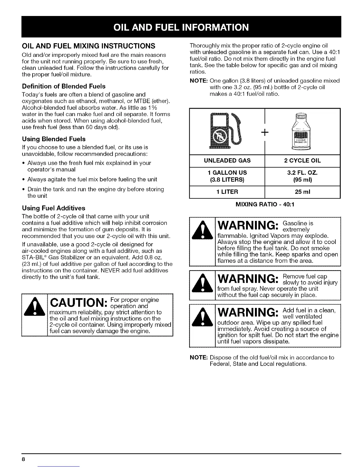 tank. See the table below for specific gas and oil mixing