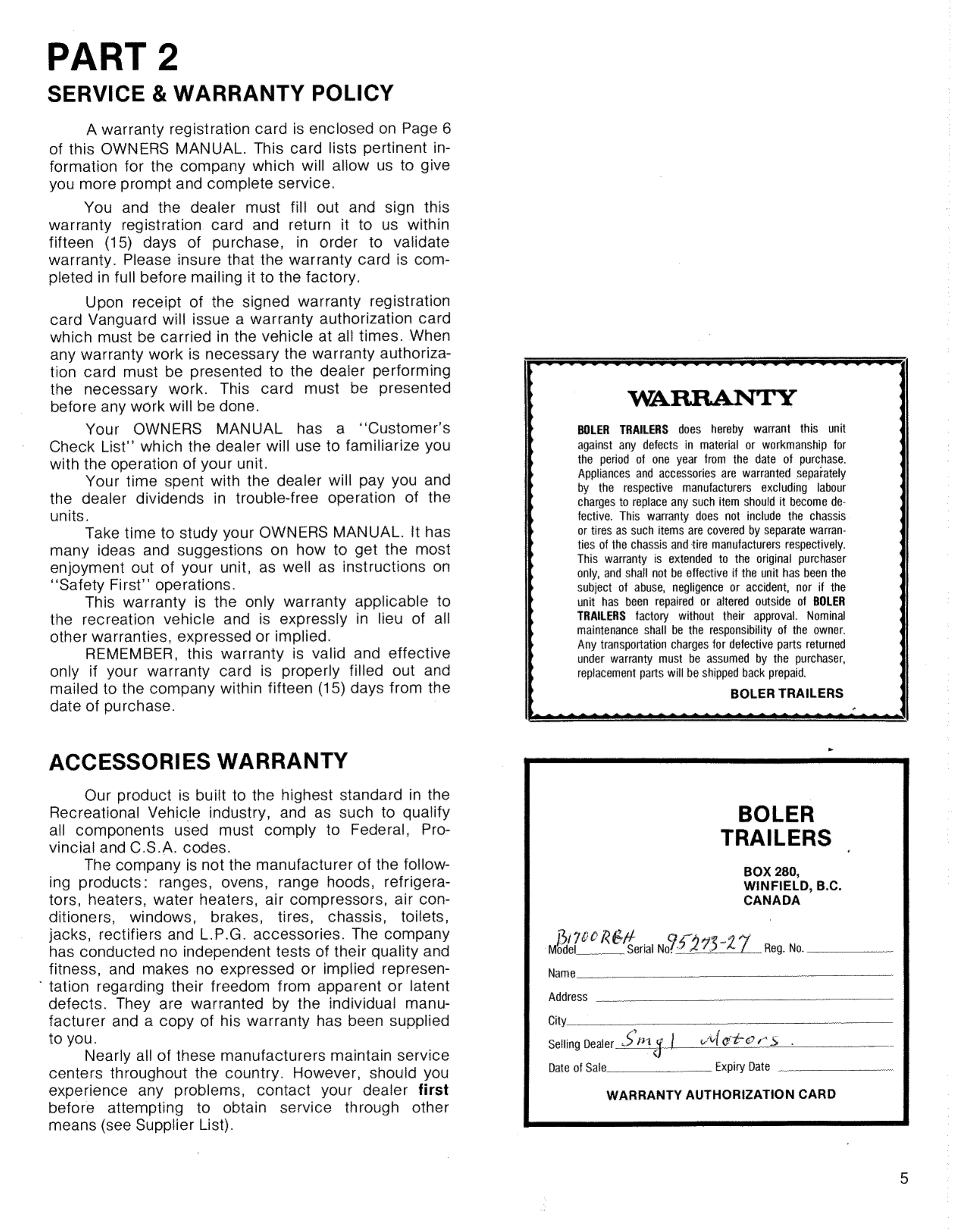 Boler B-1300S - PART 2 SERVICE & WARRANTY POLICY; ACCESSORIES WARRANTY
