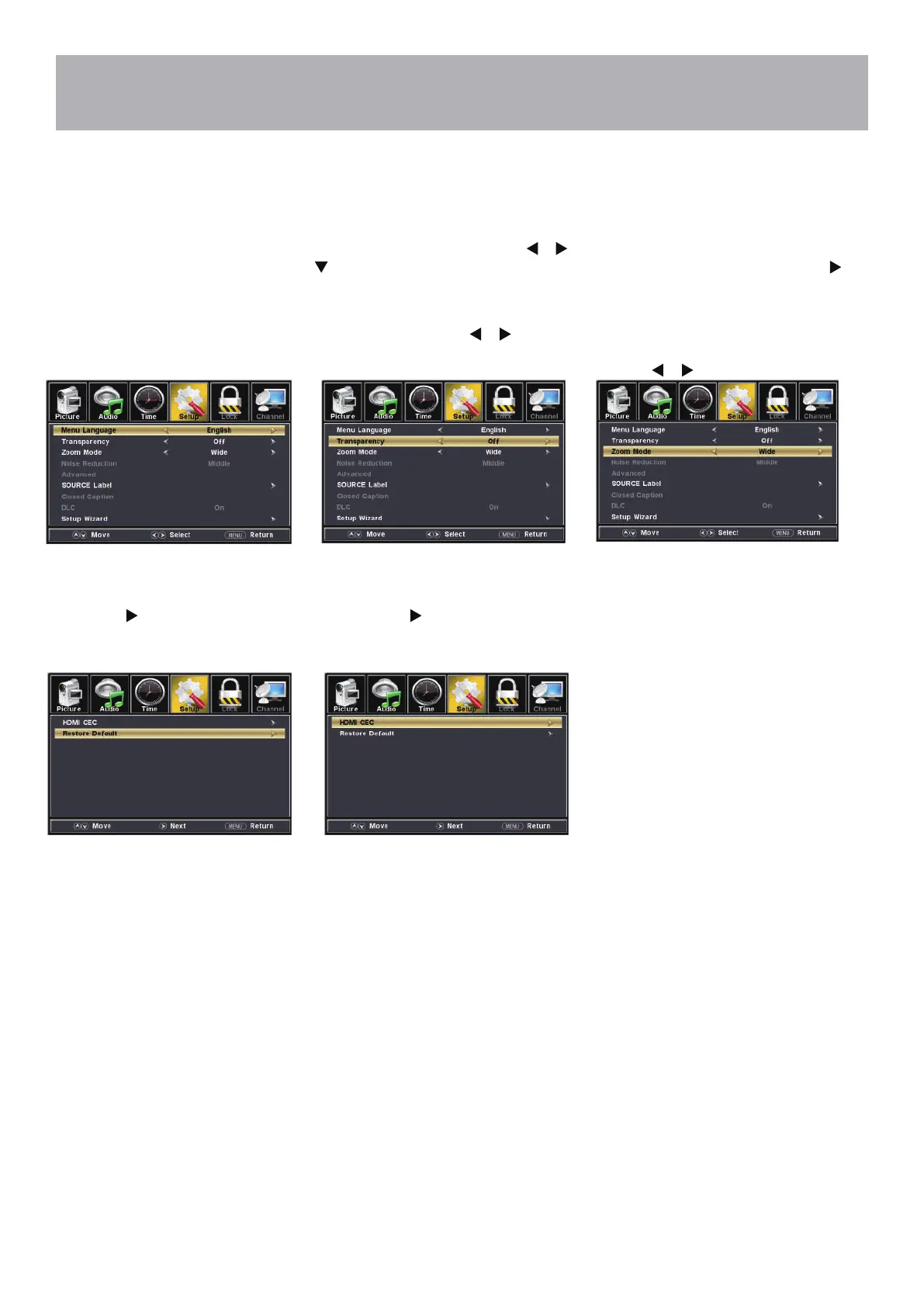 In the Setup menu you may change the initial set up of preferences that include settings for language, menu display,
