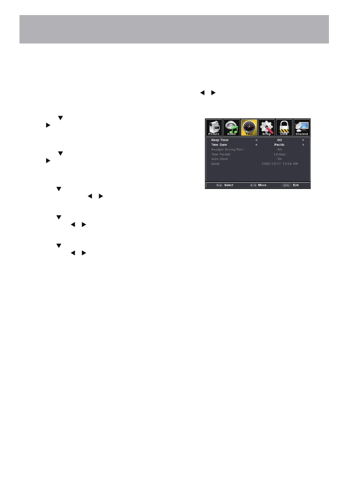 Press the MENU button on the remote control. Navigate using arrow buttons to select Time.
