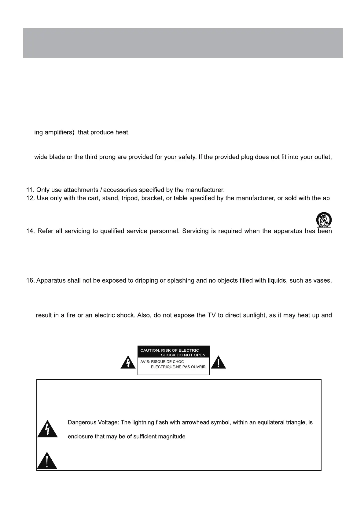 18. This TV is not designed for outdoors installation. Do not expose the TV to rain, as it may