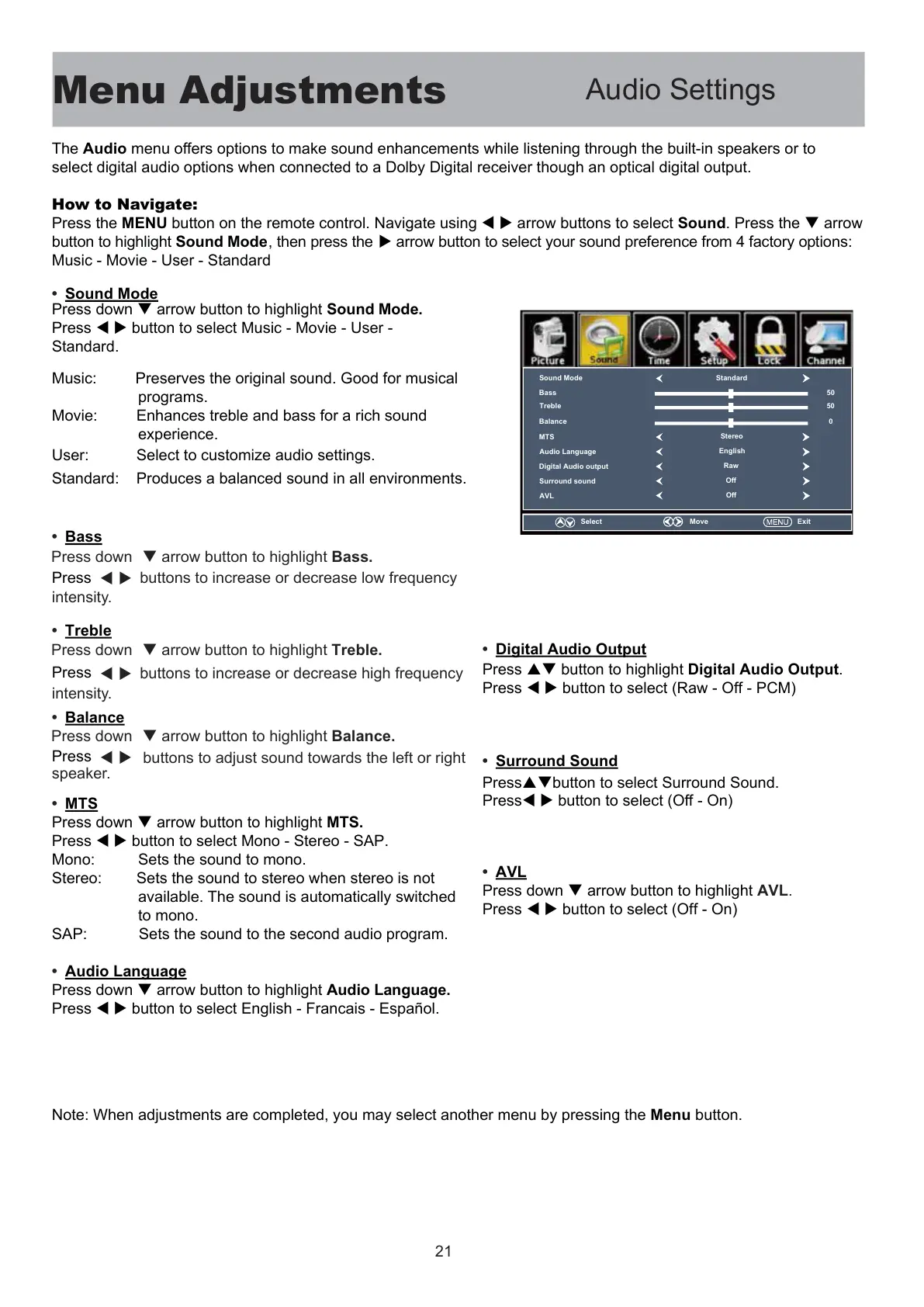 button to highlight Sound Mode, then press the X arrow button to select your sound preference from 4 factory options: