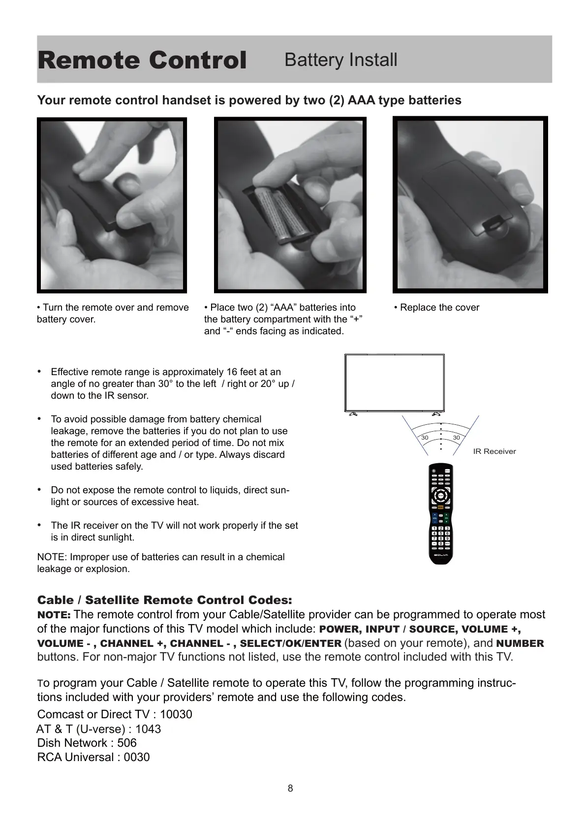 NOTE: The remote control from your Cable/Satellite provider can be programmed to operate most