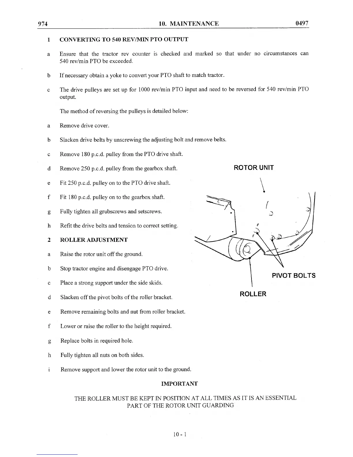 Bomford B324 - 10. MAINTENANCE; CONVERTING TO 540 REV;MIN PTO OUTPUT; ROLLER ADJUSTMENT