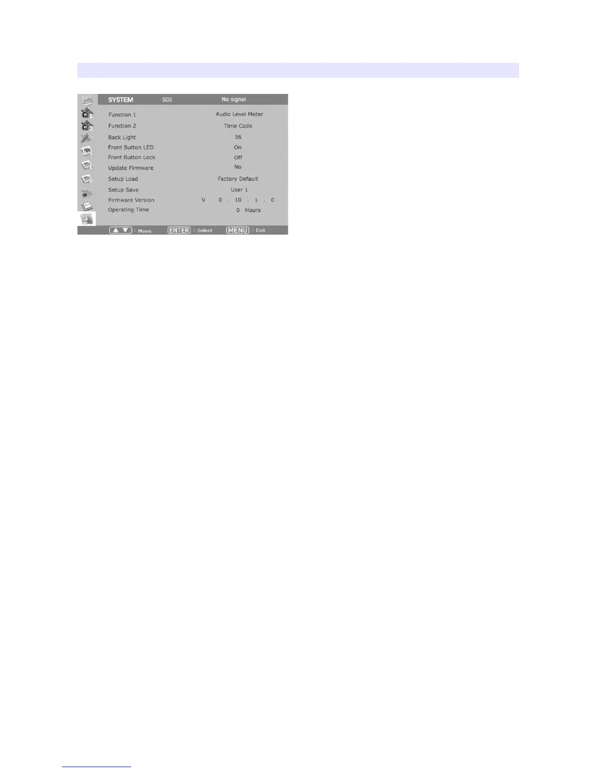 Turns update mode on. Select Serial or USB port for update. After firmware update, the monitor