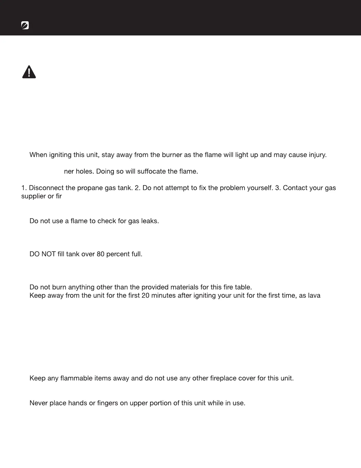 • LP GAS WARNING: Do not use any more than 1/4in depth lava rocks/pumice stones/LavaGlass