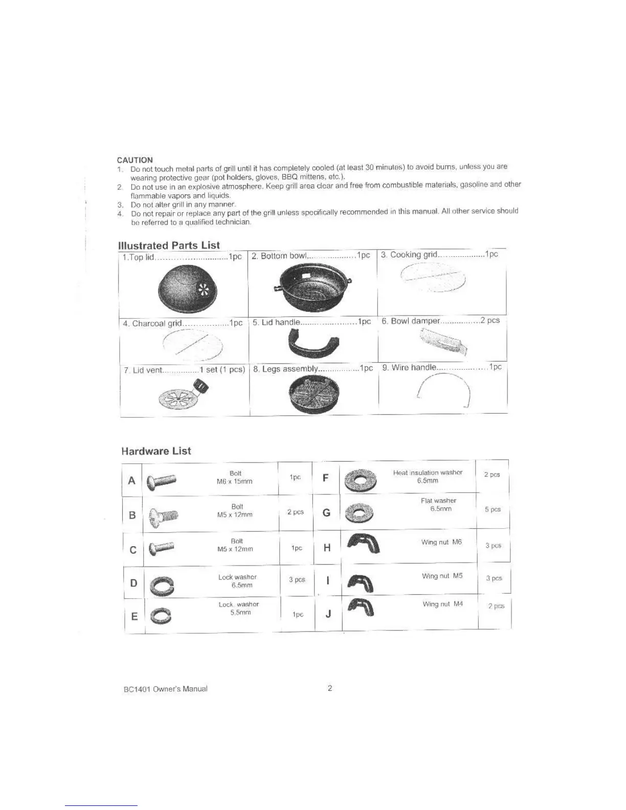 Bond BC1401 - CAUTION; Handling and Maintenance Precautions; Illustrated Parts List; Hardware List