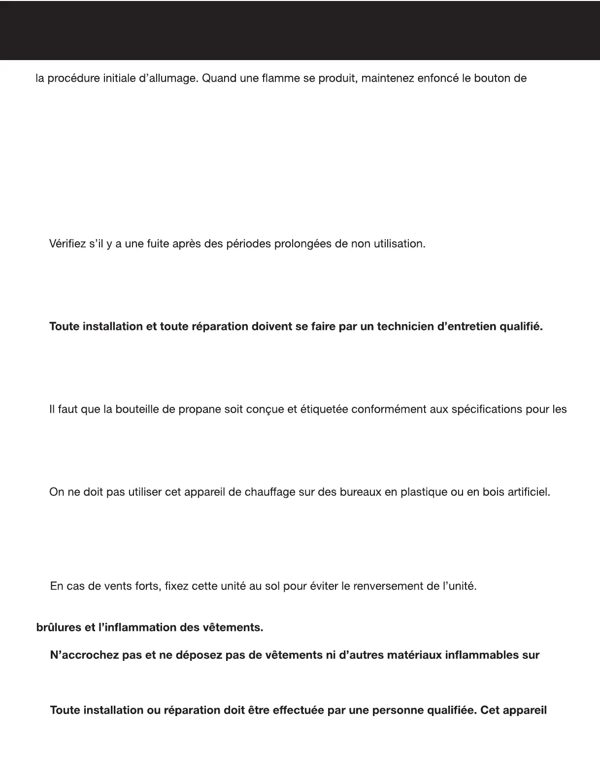 t Inspectez tous les éléments de cet appareil de chauffage avant chaque usage. S’il y a des