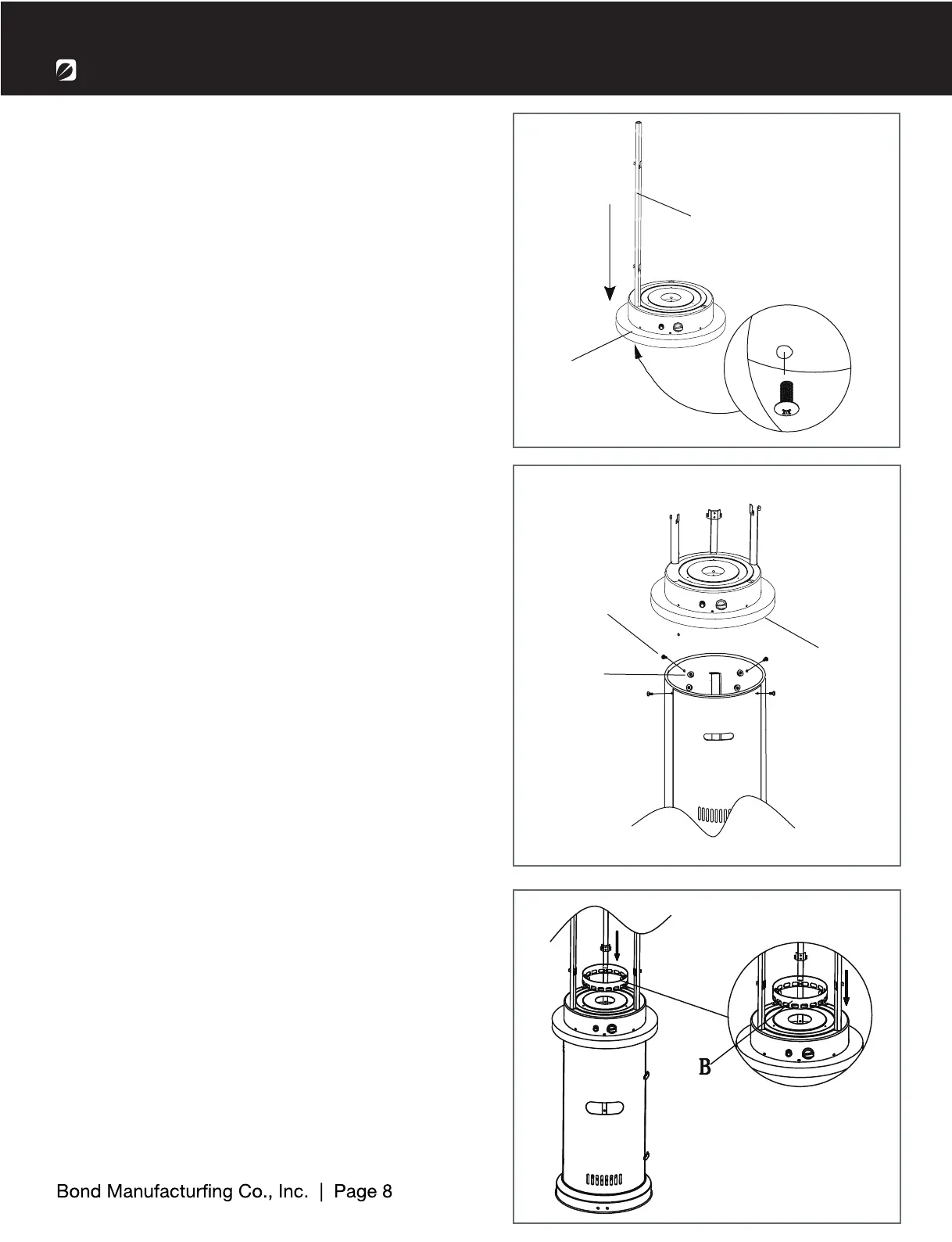 (B) to the top of the burner (C) using the 3 screws