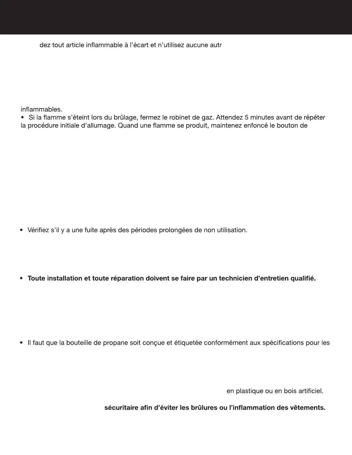 • N’entreposez pas une bouteille de propane de rechange sur ou à proximité de cette unité.