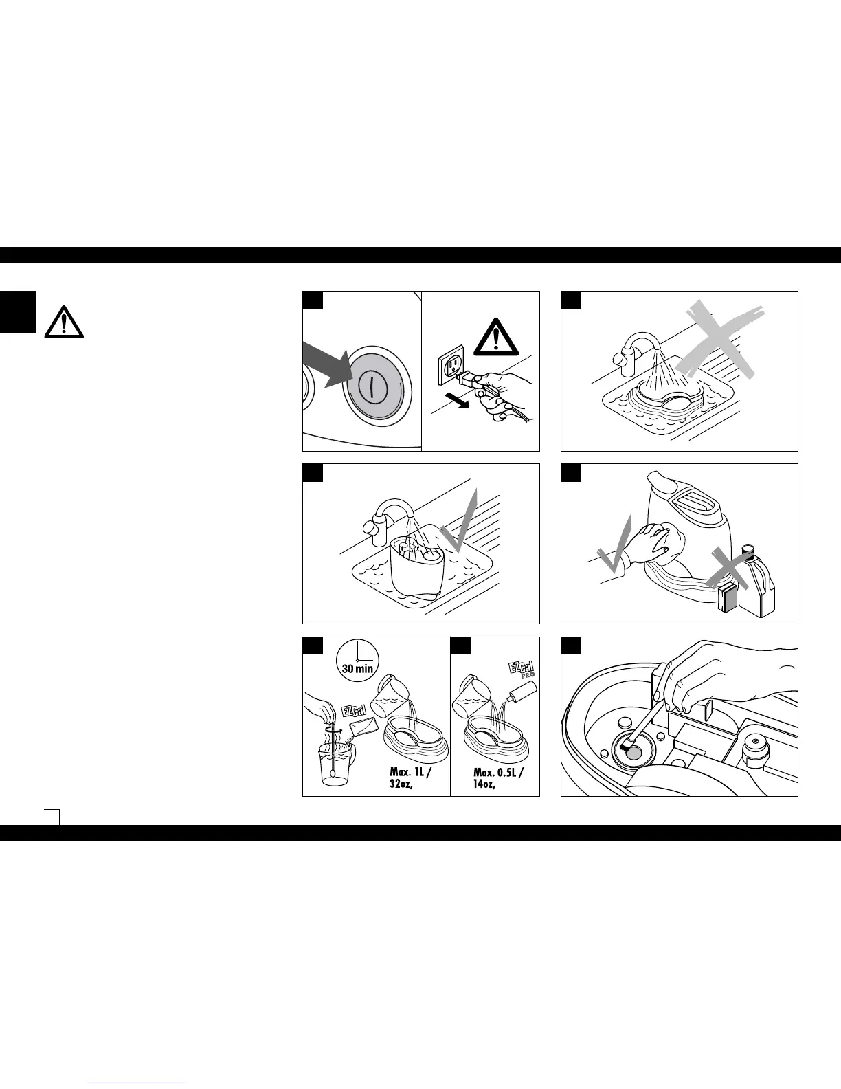 • Clean the water tank and the base regularly. Use water