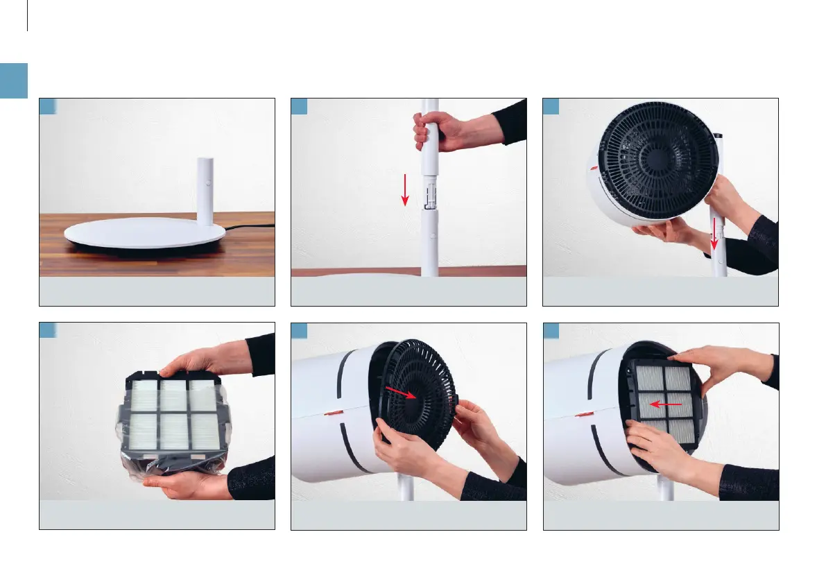 Introduisez la colonne de support dans le socle. Positionnez l’unité de ventilation sur la colonne de
