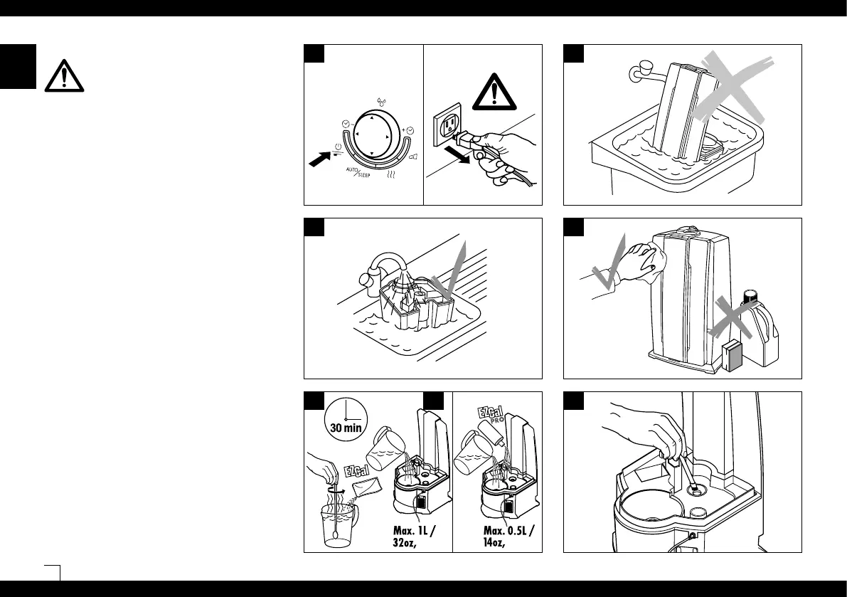 • Clean the water tank and the base regularly. Use water